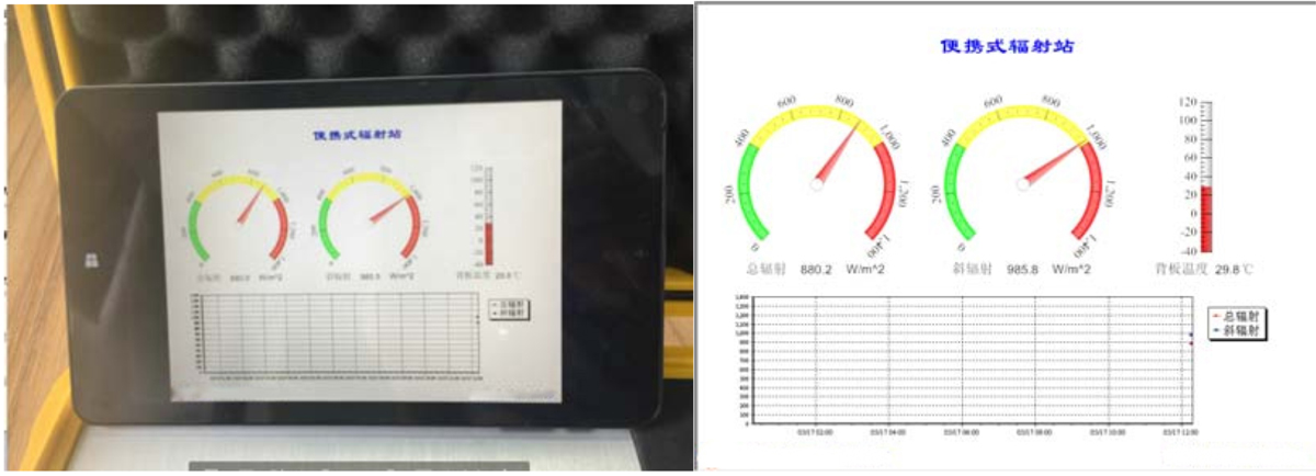 作為定制的系統該便攜式系統還可滿足用戶同時對水平輻射、太陽能板斜輻射和太陽能板背板溫度的測量。利用便攜式三角支架將輻射表進行水平安裝輻射表自帶的水平儀可調節水平,利用定制的安裝支架將輻射表安裝在太陽能板上,可保證輻射表和太陽能板在同一平面上。輻射表和背板溫度傳感器航空插頭和數采通過,數采可自動存儲數據(標準的存儲格式可存儲 5 年的數據過WIFI 信號,由筆記本電腦平板電腦或手機進行數據的讀取及下載。
