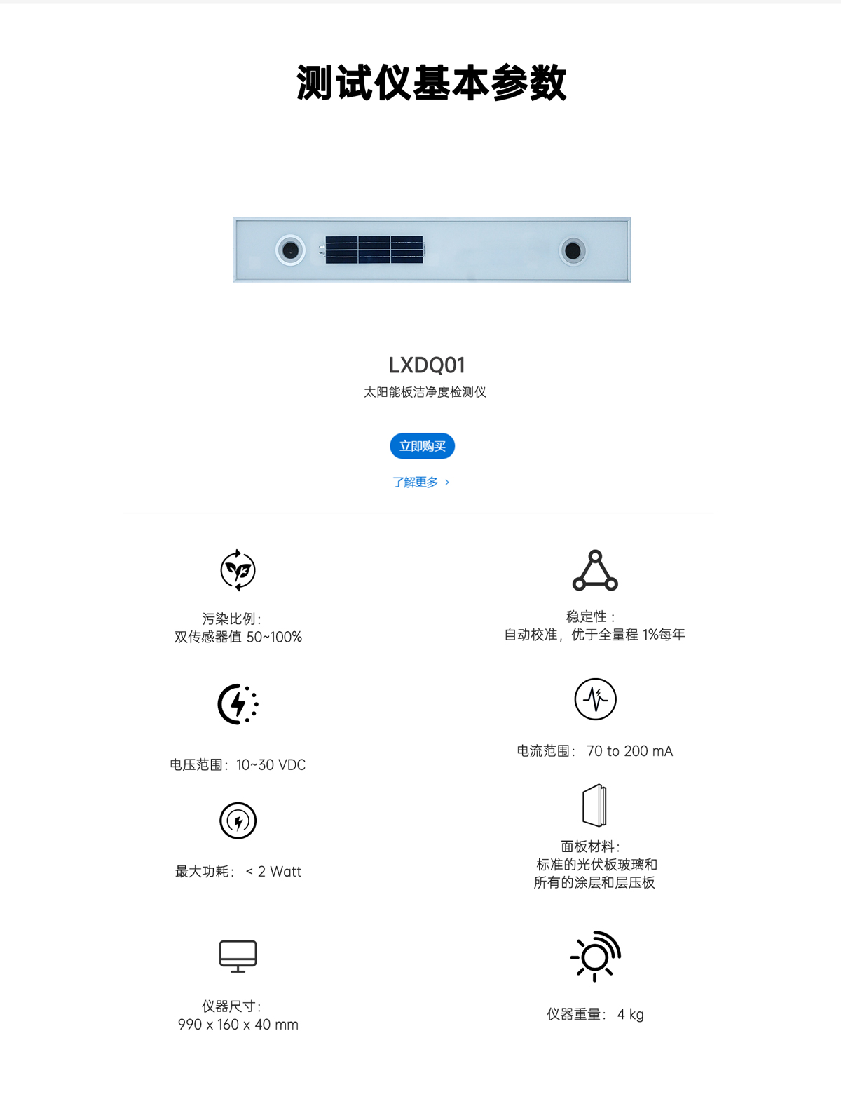 因?yàn)榇笮凸夥娬驹谡麄€(gè)園區(qū)中有不同的污染率,所以IEC 61724-1 標(biāo)準(zhǔn)中要求多點(diǎn)測(cè)量。與傳統(tǒng)系統(tǒng)相比,太陽(yáng)能板污染指數(shù)檢測(cè)儀 LX-DQ01的采購(gòu)成本、安裝和維護(hù)成本要低得多,并且更加客觀和準(zhǔn)確。