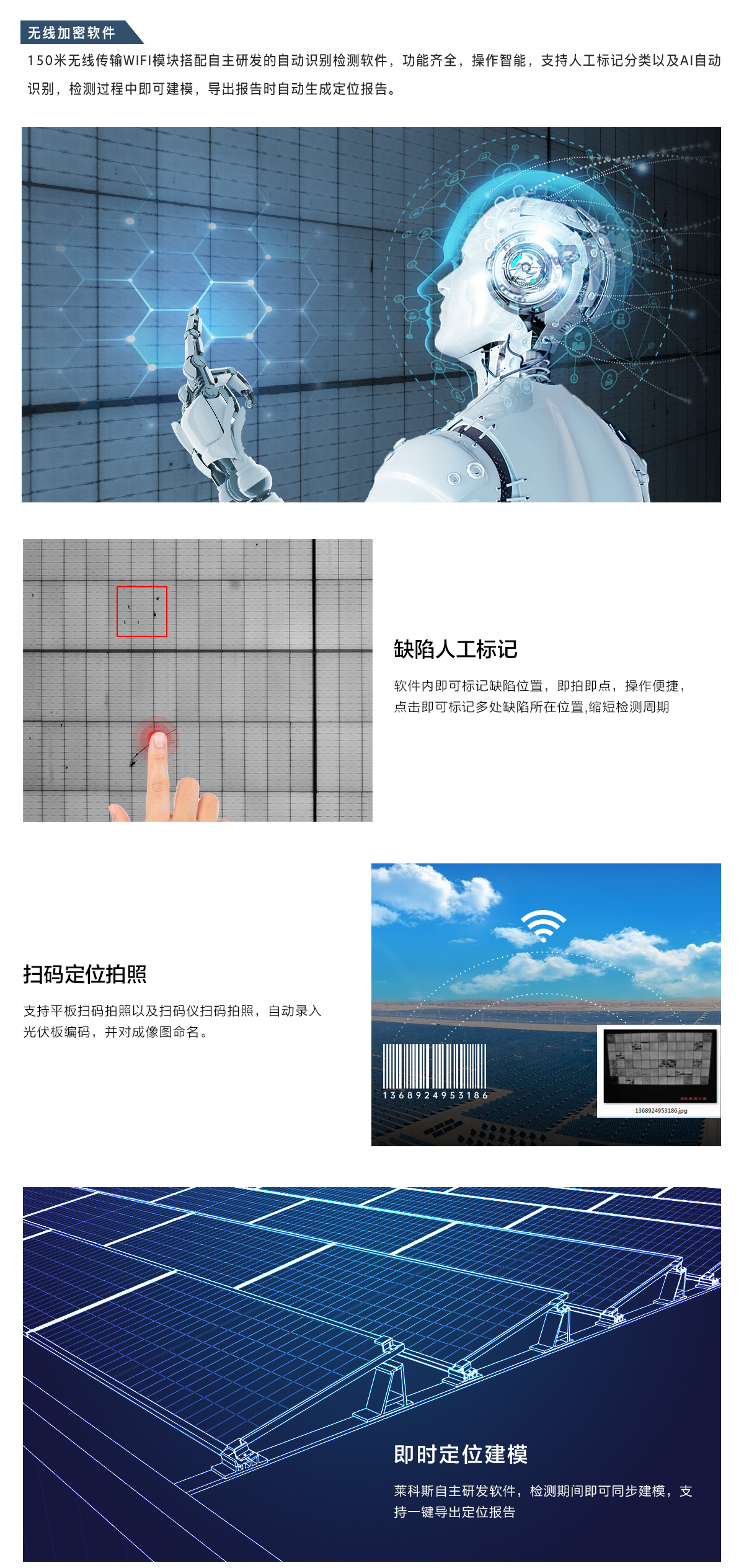 LAILX云管理平臺,集圖像管理、圖像存儲、電站建模、項目管理、圖像編輯、Ai隱裂缺陷識別、報告診斷等功能。云平臺可最大完成一次30萬張檢測圖的Ai批量診斷,速度快至100ms/p,LAILX云平臺具備了大模型自我學習能力,在不斷的數據診斷與不同新組件建模學習過程中,Ai數據庫自動迭代更新,可使的識別組件種類更多,識別缺陷類型更準確。